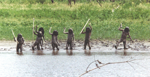 The idea is that the tribe members try to sneak up on their unsuspecting victims and